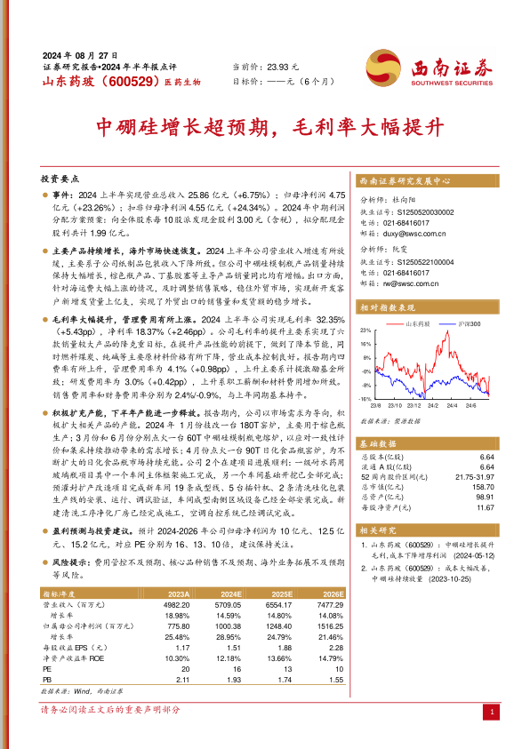 2024年上半年,山东药玻实现了营业总收入25.86亿元,同比增长6.75%。归属于母公司股东的净利润达到4.75亿元,同比大幅增长23.26%。扣除非经常性损益后的归母净利润为4.55亿元,同比增长24.34%。公司董事会已提出2024年中期利润分配预案,拟向全体股东每10股派发现金股利3.00元(含税),预计分配现金股利总额为1.99亿元。