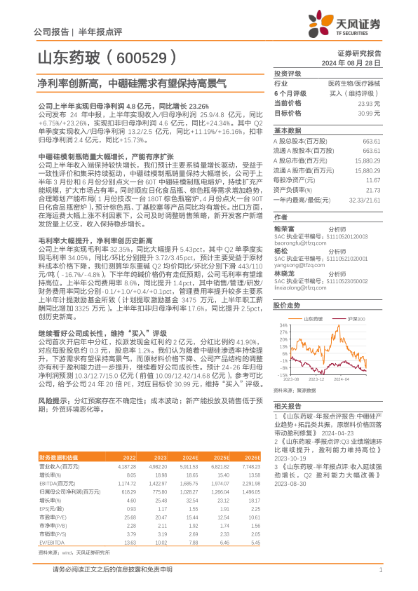 公司首次开启年中分红,拟派发现金红利约2亿元,分红比例约41.90%,对应每股股息约0.3元,股息率1.2%。我们认为随着中硼硅渗透率持续提升,下游需求有望保持高景气,而原材料价格下降、公司产品结构的调整亦有利于盈利能力进一步提升,继续看好公司成长性。预计24-26年归母净利润预测10.3/12.7/15.0亿元(前值10.09/12.42/14.68亿元),参考可比公司,给予公司24年20倍PE,对应目标价30.99元,维持“买入”评级。