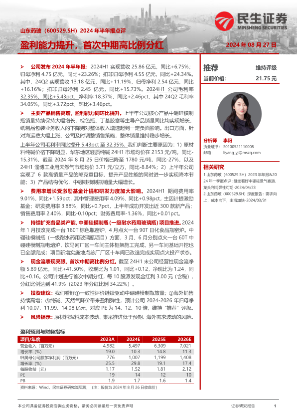 上半年公司毛利率同比提升5.43pct至32.35%,我们判断主要原因为:1)原材料纯碱价格下降明显,华东地区轻质纯碱24H1市场均价在2153元/吨,同比-15.31%,截至2024年8月25日价格已降至1780元/吨,同比-27%,以及24H1淄博工业用天然气市场均价3.71元/立方,同比-8.84%;2)上半年公司实现了6款高销量产品的降克重目标,提升产品性能的同时进一步实现降本节能;3)产品结构优化,中硼硅模制瓶销量大幅增长。