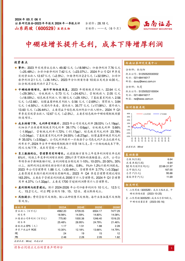 本报告对山东药玻2023年年报及2024年一季报进行了全面分析。公司在2023年及2024年一季度均表现出良好的增长势头,主要得益于中硼硅模制瓶的快速增长和海外市场的恢复。成本控制方面,纯碱价格下降有助于提升公司盈利能力。但同时,员工激励计划导致管理费用有所增加。