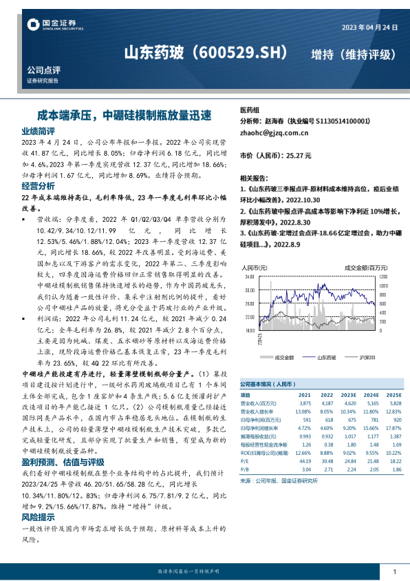 本报告对公司2022年及2023年第一季度的业绩进行了简要回顾和深入分析。公司在营收和净利润方面均实现稳健增长,尤其2023年Q1表现亮眼。尽管面临原材料成本高企的挑战,公司通过积极的经营策略和产品结构优化,特别是中硼硅模制瓶业务的快速发展和产能建设的有序推进,展现出强大的增长韧性。随着药玻行业产业升级的深入,公司作为行业龙头,有望凭借其技术优势和市场地位,在中硼硅产品领域实现进一步放量,从而驱动未来业绩持续增长。报告维持“增持”评级,并提示了市场需求和成本上升等潜在风险。