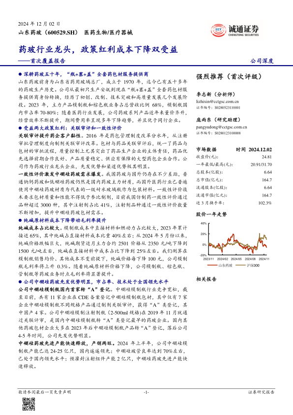 山东药玻作为中国药玻行业的领军企业,凭借其五十余年的深厚积淀、全面的药包材解决方案以及在高端中硼硅药玻领域的显著先发优势,确立了其市场龙头地位。在关联审评和一致性评价两大政策红利的推动下,以及纯碱等原材料成本下降的有利因素下,公司盈利能力有望持续提升。未来,随着中硼硅模制瓶先进产能的快速释放和市场需求的增长,公司业绩增长确定性强。当前估值相较同业具有显著性价比,具备较高的投资价值。尽管面临市场需求波动、原材料价格变动和政策推进不及预期等风险,但公司凭借其核心竞争力,仍被给予“强烈推荐”评级。