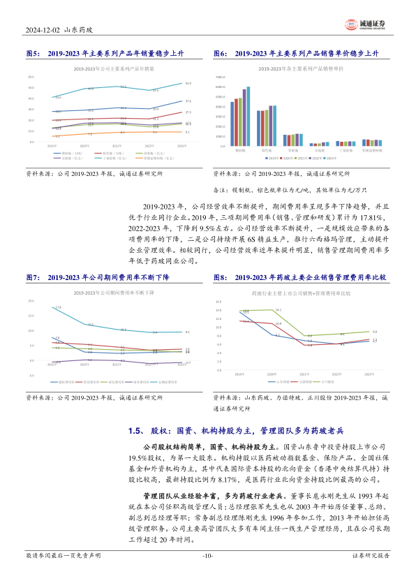 2019-2023年,公司主要药玻产品销量和销售单价均实现稳步增长。模制瓶销量年复合增速达7.7%,销售单价年复合增速亦达7.7%,主要得益于高价值中硼硅模制瓶产品销量的提升和产品顺价传导。同期,公司经营效率不断提升,期间费用率从2019年的17.81%下降至2022-2023年的9.5%左右,且优于同行业企业,体现了规模效应和精益生产管理的成效。公司股权结构以国资和机构持股为主,管理团队经验丰富,多为药玻行业资深人士。