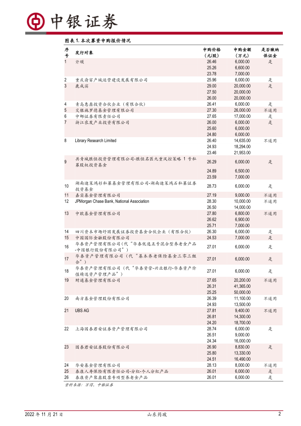2022年11月18日,山东药玻发布2021年度定向增发情况报告书,成功募集资金18.66亿元,扣除发行费用后净募资18.42亿元。本次定增发行价格为27.19元/股,发行股数6864.64万股。共有34家投资者进行了有效报价,报价区间为23.46-29.00元/股,最终有18家机构及个人投资者成功认购。发行价格27.19元/股较大幅度高于定价下限,充分证明了公司在资本市场的较高认可度。
