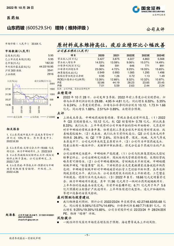 上游成本居高,中硼硅药玻销售稳健,常规业务疫后有所恢复。(1)2022年Q3实现销售收入10.12亿元,较Q2销售增加0.78亿元,环比改善8.33%;我们认为,上半年疫情对公司市场开拓的影响开始转好,尤其是针对非中硼硅的常规业务开展,但考虑到三季度全球及中国疫情时有波动,改善幅度较缓和。(2)成本端,我们认为目前仍处高位,Q3公司总体毛利率维持在26.8%,较Q2下降2.6%,国际海运费、煤炭、纯碱、天然气等成本居高不下,公司毛利率未恢复至原有水平。(3)公司作为中国药玻龙头,随着注射剂一致性评价、关联审评审批推进,将充分受益于药玻行业的产业升级。