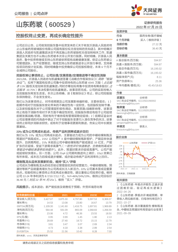 公司成长为模制瓶龙头的经历验证管理层优异的经营能力,中硼硅模制瓶、预灌封等新产品销量高增长为公司再成长注入新活力,22fy公司基本面或迎重要拐点。控股权转让事项终止夯实再成长确定性,建议重视公司投资价值。维持公司22-24年净利润为8.7/10.7/12.7亿,YoY+46%/24%/19%,维持公司目标价36.40元(对应22年PE约25x),维持“买入”评级。