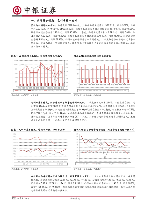 业绩符合预期,营收与利润均稳健增长。上半年公司实现营收19.77亿元,同增9.07%;归母净利3.22亿元,同增6.94%,EPS0.54元/股;销售商品提供劳务收到的现金流16.74亿元,同增10.98%,经营活动现金净流量1.13亿元,同降40.33%。二季度,公司实现营业收入9.34亿元,同增5.46%;归母净利润1.69亿元,同增16.52%;销售商品提供劳务的现金流8.74亿元,同增15.75%,经营活动现金净额1.52亿元,同降39.45%。公司中报业绩保持了一贯的稳健,二季度归母净利增速创近6个季度新高,营收也保持一贯的稳健增长。现金净流量下降较多主要是因为公司购买原材料增加,现金流入仍相对稳定。