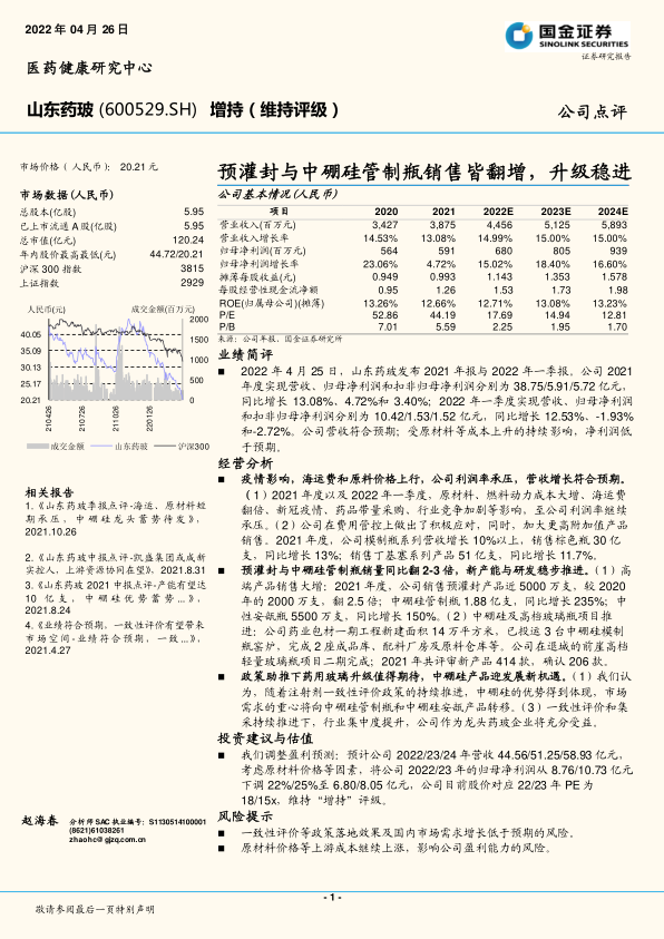 2022年4月25日,山东药玻发布2021年报与2022年一季报。公司2021年度实现营收、归母净利润和扣非归母净利润分别为38.75/5.91/5.72亿元,同比增长13.08%、4.72%和3.40%;2022年一季度实现营收、归母净利润和扣非归母净利润分别为10.42/1.53/1.52亿元,同比增长12.53%、-1.93%和-2.72%。公司营收符合预期;受原材料等成本上升的持续影响,净利润低于预期。