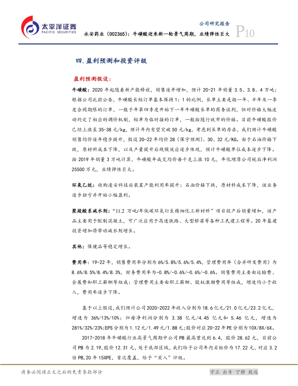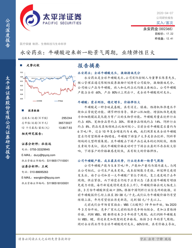 报告指出,公司股价对应20-22年PE分别为10X/8X/6X,目前PB为2.19,处于底部区域。给予公司年内目标价17.22元,对应3.2倍PB和20年15XPE,首次覆盖给予“买入”评级。主要风险提示包括牛磺酸提价幅度不及预期和海外需求下滑导致销量不及预期。