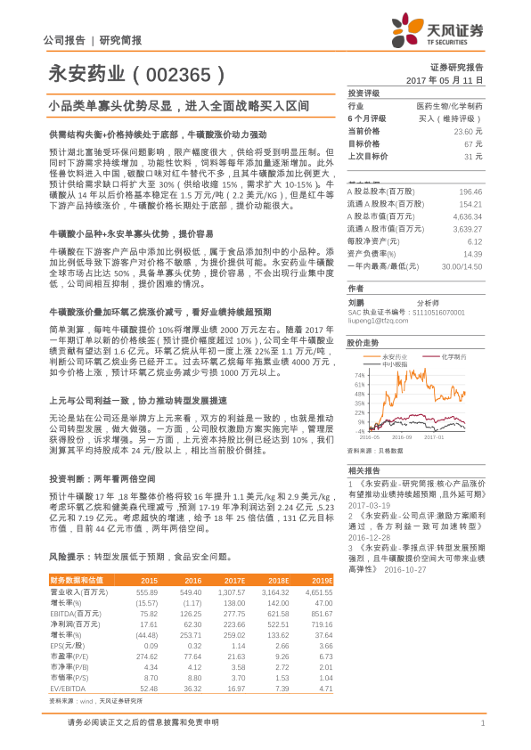 永安药业凭借其在牛磺酸市场的全球寡头地位,正迎来由供需失衡和价格长期底部驱动的强劲涨价周期。牛磺酸作为小品种添加剂,其价格弹性高,且公司50%的市场份额赋予其强大的提价能力。同时,环氧乙烷业务的减亏以及上元资本的战略协同,将共同推动公司业绩持续超预期增长和转型发展提速。报告预测,在牛磺酸价格持续上涨和业务结构优化的背景下,永安药业2017-2019年净利润将分别达到2.24亿元、5.23亿元和7.19亿元。基于超快的增速,给予2018年25倍估值,目标市值131亿元,相比当前44亿元市值,具备两年两倍的增长空间。结合近期业绩表现验证了预测的准确性,报告强烈建议“买入”永安药业。