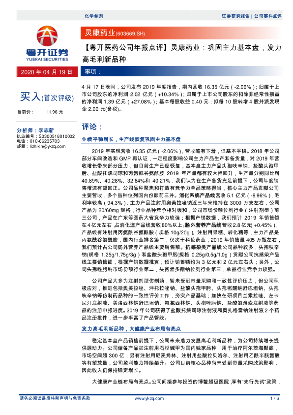 【粤开医药公司年报点评】灵康药业:巩固主力基本盘,发力高毛利新品种
