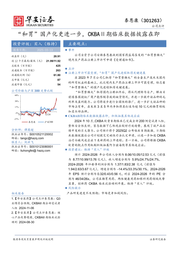 泰恩康正通过“和胃整肠丸”的国产化和创新药CKBA的临床进展,积极推动公司业绩增长和市场拓展。随着“和胃整肠丸”注册上市许可的受理,公司将实现自产,解决产能瓶颈,并计划在3-5年内将其打造为超10亿元的头部品牌,显著提升盈利能力。同时,CKBA软膏II期临床数据即将披露,其良好的安全性和疗效趋势预示着巨大的市场潜力,公司正积极申请突破性疗法认定并拓展其他适应症。尽管2024年净利润预计短期承压,但2025-2026年公司收入和净利润预计将实现稳健增长,显示出公司在核心产品优势和创新驱动下的长期发展潜力。基于上述分析,华安证券维持对泰恩康的“买入”评级。