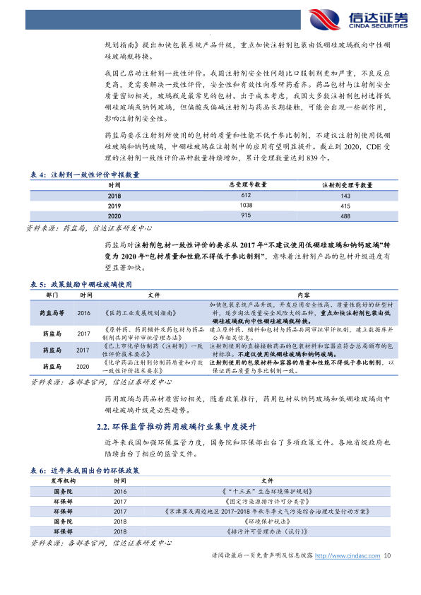 药用玻璃集中度持续提升,中硼硅前景广阔。我国药用玻璃以钠钙玻璃和低硼硅玻璃为主,而欧美发达国家主要采用中硼硅玻璃。中硼硅玻璃的化学稳定性、热稳定性、硬度等指标优势更明显,我国政策推进药用玻璃向中硼硅玻璃升级。一致性评价加快中硼硅玻璃应用,尤其是注射剂所使用的包材的质量和性能不低于参比制剂,不建议注射剂使用低硼硅玻璃和钠钙玻璃。药用玻璃行业具有高耗能、高污染的特点,环保监管趋严导致小企业逐步淘汰,行业集中度持续提升。