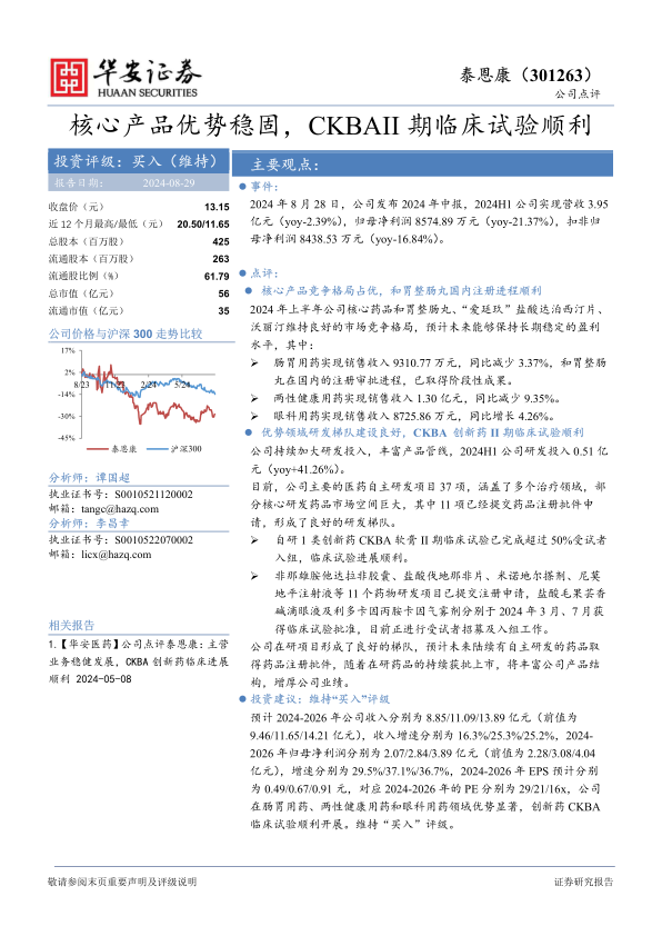 本报告指出,泰恩康(301263)在2024年上半年面临营收和净利润的短期压力,但其核心产品在市场竞争中仍保持优势地位。公司持续加大研发投入,特别是1类创新药CKBA软膏的II期临床试验进展顺利,预示着未来业绩增长的潜力。