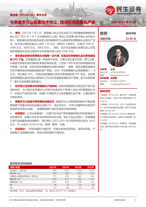 2023年7月2日,泰恩康公告与泰国李万山药厂签署《技术转让合作备忘录》,泰恩康将以1.95亿元人民币受让和胃整肠丸全套生产技术,并约定每年支付2500万元人民币的销售分成费。