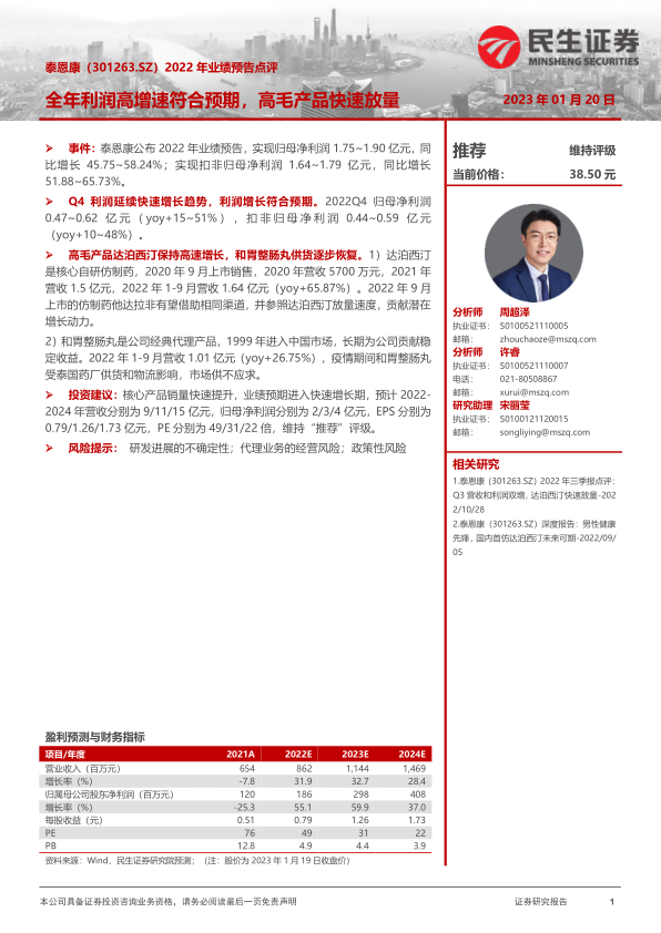 泰恩康2022年业绩预告显示利润高增速,符合市场预期。达泊西汀等高毛利产品快速放量是主要增长动力,和胃整肠丸供货恢复也贡献稳定收益。维持“推荐”评级,但需关注研发、代理业务及政策风险。