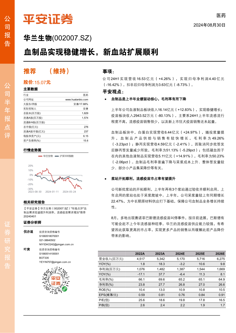 维持“推荐”评级。考虑血制品批签发、流感疫苗降价等因素,调整2024-2026年盈利预测,估计归母净利润为13.87、15.44、16.69亿元(原16.03、17.56、18.82亿元)。浆站的快速开拓有望帮助公司血制品业务加速增长,在远期获得更大空间。维持“推荐”评级。