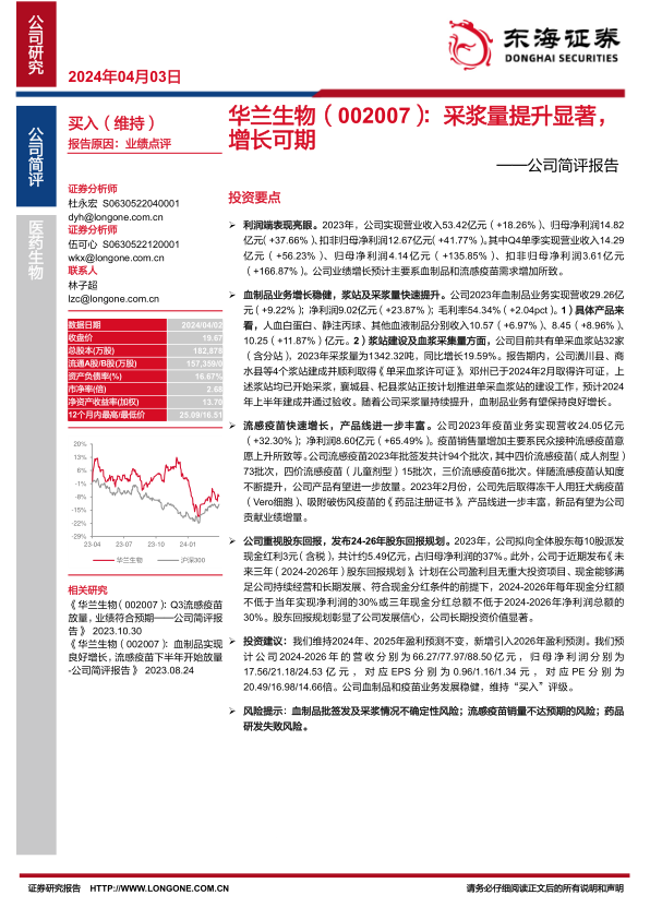 华兰生物2023年业绩表现亮眼,血制品业务稳健增长,采浆量提升显著,疫苗业务快速发展,产品线不断丰富。公司重视股东回报,发布未来三年股东回报规划,彰显长期投资价值。维持“买入”评级,但需关注血制品批签发、采浆情况、流感疫苗销量以及药品研发等风险。