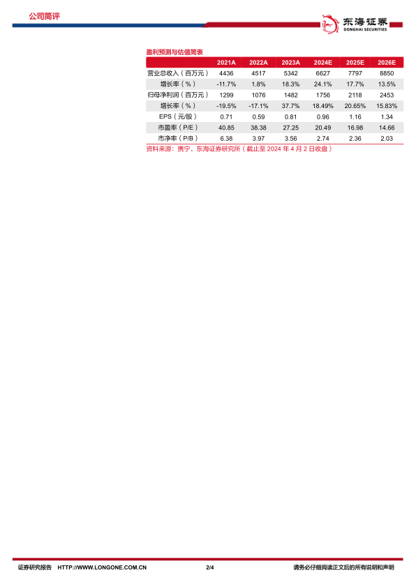维持2024年、2025年盈利预测不变,新增引入2026年盈利预测。预计公司2024-2026年的营收分别为66.27/77.97/88.50亿元,归母净利润分别为17.56/21.18/24.53亿元,对应EPS分别为0.96/1.16/1.34元,对应PE分别为20.49/16.98/14.66倍。维持“买入”评级。
