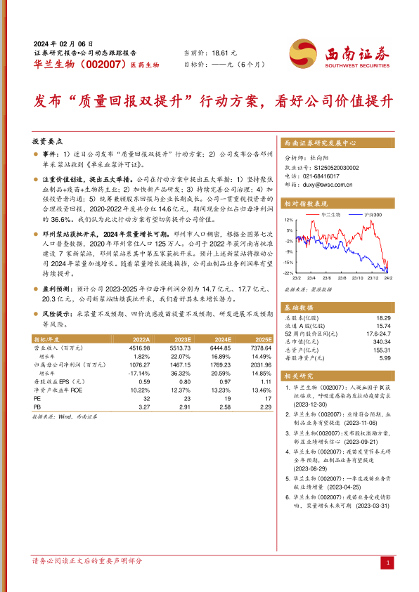 华兰生物通过发布“质量回报双提升”行动方案,明确了其在血制品、疫苗和生物药三大核心业务领域的战略重心,并致力于通过加快研发、优化治理和加强投资者沟通来提升公司价值。邓州单采血浆站的获批开采,预计将成为公司2024年采浆量加速增长的关键驱动力,从而持续提升血制品业务的利润率,为公司整体业绩增长提供坚实支撑。尽管存在采浆量、疫苗放量及研发进展不及预期等风险,但基于新浆站的积极影响和公司战略规划,分析师对华兰生物未来的盈利能力和成长潜力持乐观态度,预计未来三年归母净利润将实现稳健增长。公司财务数据显示其盈利能力和成长性均有望持续改善。