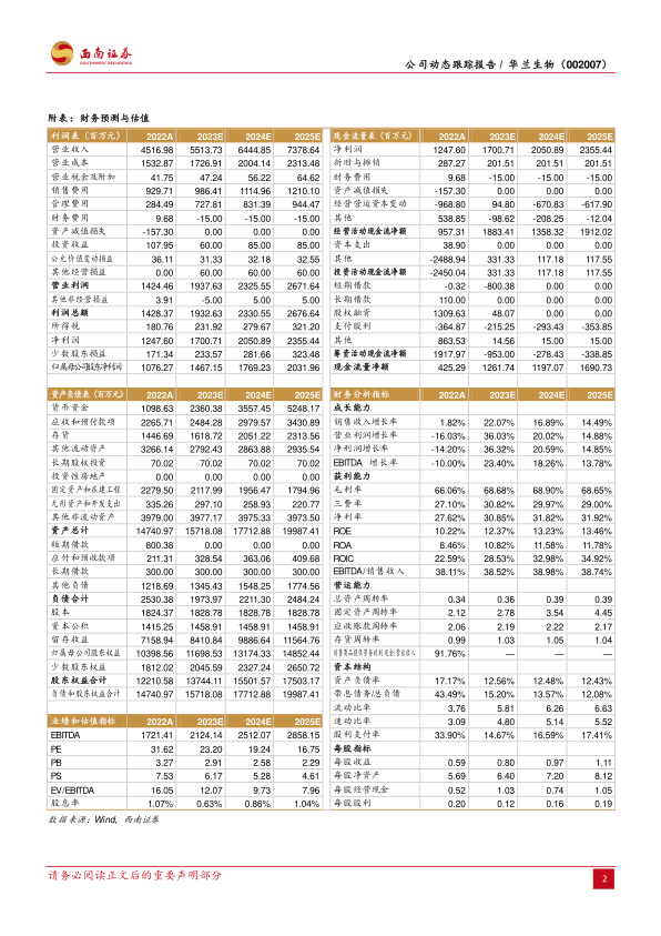 基于新浆站的陆续获批开采及其对采浆量的积极影响,分析师对华兰生物未来的业绩增长潜力持乐观态度。预计公司2023年至2025年的归母净利润将分别达到14.7亿元、17.7亿元和20.3亿元,呈现稳健的增长态势。 报告同时提示了潜在风险,包括:
