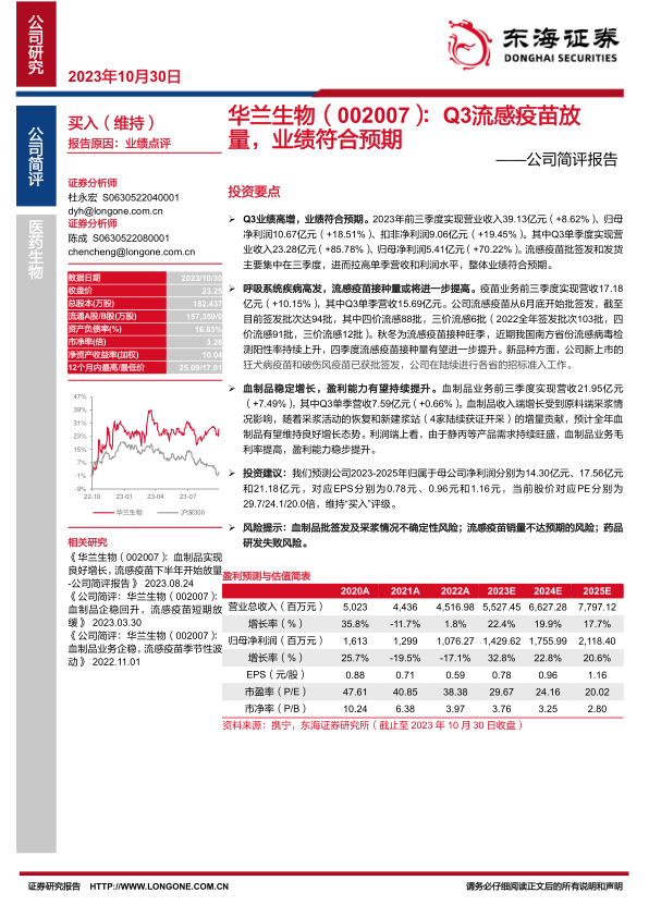 华兰生物在2023年前三季度展现出强劲的业绩增长,特别是第三季度,得益于流感疫苗的集中放量和血制品业务的稳定贡献。公司两大核心业务板块均表现良好,流感疫苗批签发量显著增加,且新品种逐步上市;血制品业务在采浆恢复和新建浆站的推动下,收入和盈利能力持续提升。鉴于公司稳健的业务发展和良好的市场前景,分析师维持“买入”评级,并预计未来几年净利润将持续增长。