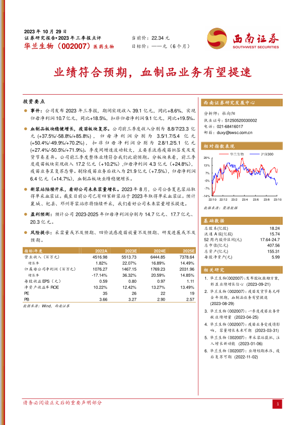 本报告对华兰生物2023年三季报进行了详细分析,指出公司业绩符合预期,血制品业务有望提速。公司疫苗业务呈现复苏态势,血制品业务稳健增长。新浆站的陆续开采预示着未来浆量增长可期,为公司业绩提供有力支撑。报告同时提示了采浆量、疫苗放量以及研发进展等方面存在的风险。