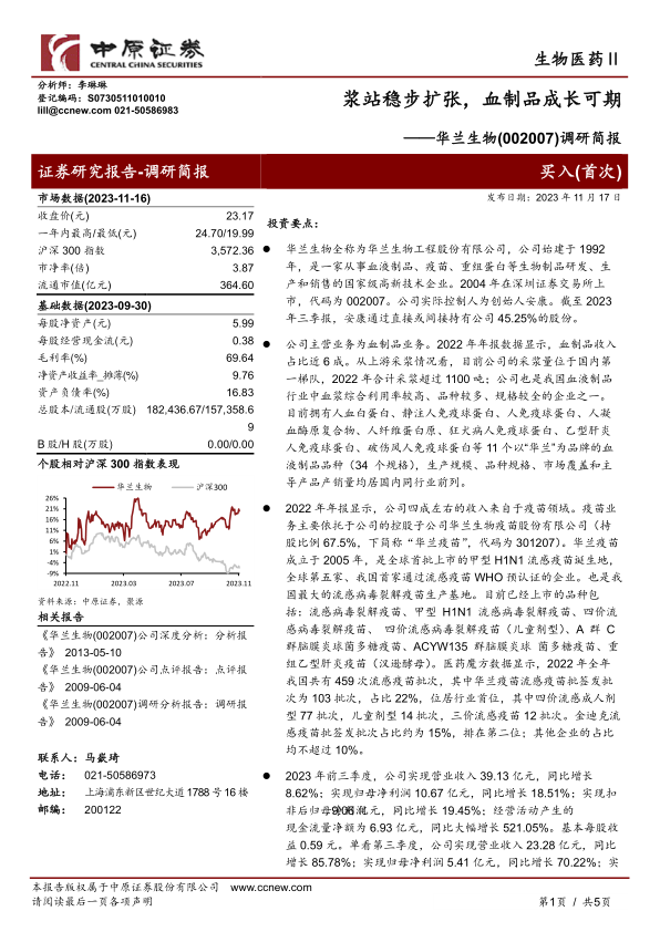 华兰生物凭借其在血液制品和疫苗领域的领先地位,展现出强劲的增长势头。2023年前三季度,公司营收和净利润均实现显著增长,特别是第三季度业绩表现亮眼。血液制品业务受益于采浆量的提升和市场需求的旺盛,并通过浆站的稳步扩张为未来增长奠定基础。疫苗业务则得益于流感疫苗市场的良好表现和新品的逐步上市。此外,创新药管线的推进,尤其是贝伐单抗的上市预期,将为公司提供新的增长动力。综合来看,华兰生物的多元化业务布局和持续的研发投入,使其具备良好的成长潜力,分析师因此给予“买入”评级。投资者需关注浆站扩张、疫苗销售及新药研发进度等潜在风险。