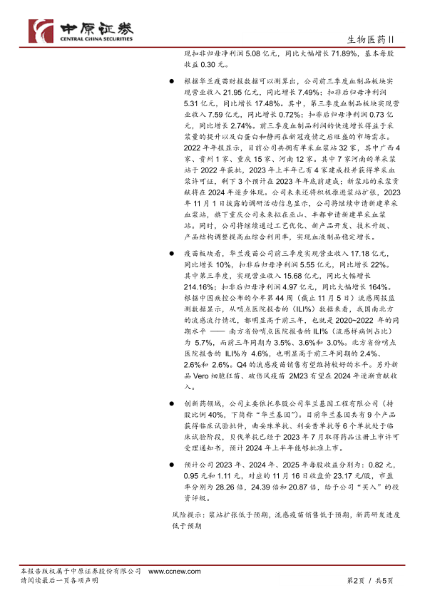 报告提示了浆站扩张低于预期、流感疫苗销售低于预期以及新药研发进度低于预期等潜在风险。