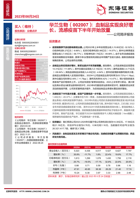 本报告分析了华兰生物2023年上半年的业绩表现,指出疫苗销售的季节性波动对公司业绩产生影响,但血制品业务保持良好增长势头,新浆站的投产将为公司带来增量。同时,流感疫苗下半年有望放量,疫苗产品管线也在不断丰富。维持对公司“买入”评级,并提示了相关风险。