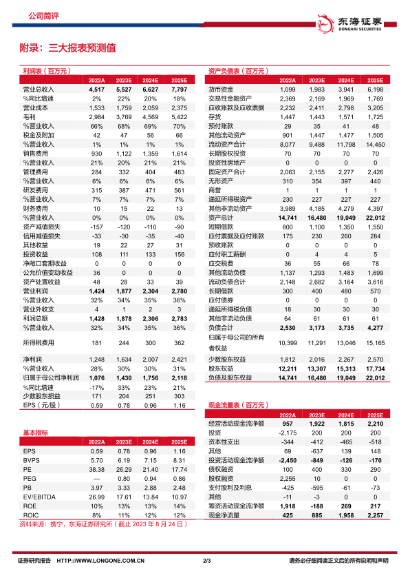 预测公司2023-2025年归属于母公司净利润分别为14.30亿元、17.56亿元和21.18亿元,对应EPS分别为0.78元、0.96元和1.16元,当前股价对应PE分别为26.3/21.4/17.7倍,维持“买入”评级。