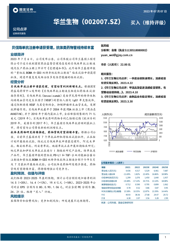 抗体类药物研发持续推进,药物管线有望持续丰富。根据公司公告,目前华兰基因共有7个单抗品种取得临床试验批件,正在按计划开展临床试验,除此次贝伐珠单抗申请获受理外,阿达木单抗、曲妥珠单抗、利妥昔单抗、地诺单抗正在开展Ⅲ期临床研究;帕尼单抗和伊匹木单抗正在进行I期临床研究产品线。除单抗类产品外,华兰基因申报的重组抗PD-L1和TGF-β双功能融合蛋白注射液和重组抗BCMA和CD3双特异性抗体注射液分别于今年5月及7月获批开展临床试验。公司抗体类药物研发稳步推进,药物管线有望持续丰富,将持续增强公司竞争力。