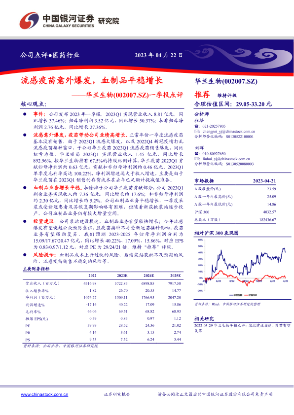 本报告对华兰生物(002007.SZ)2023年一季报进行了深度分析,维持“推荐”评级,并给出了29.05-33.20元的合理估值区间。