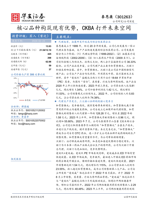 泰恩康(301263)是一家以代理业务为基础,通过持续研发拓展自产产品线的综合性医药企业。公司凭借和胃整肠丸、沃丽汀等独家代理产品建立了稳定的市场地位和现金流,同时,自主研发的“爱廷玖”和“爱廷威”在两性健康用药市场表现突出,成为新的业绩增长点。公司通过三大研发平台不断提升技术实力,尤其在创新药领域,CKBA白癜风软膏的II期临床试验启动,预示着公司在填补国内市场空白、打开未来成长空间方面迈出了关键一步。华安证券首次覆盖给予“买入”评级,预计公司未来几年营收和归母净利润将保持高速增长,但需关注研发、代理运营及进口药品再注册等风险。