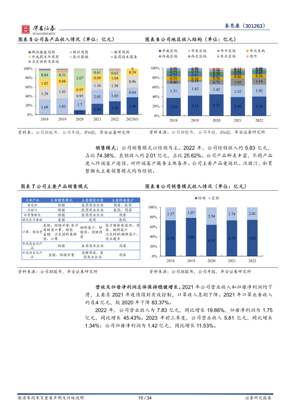 财务数据显示,公司营收和归母净利润总体保持稳健增长。2023年前三季度,公司营业收入达5.81亿元,同比增长1.34%;归母净利润达1.42亿元,同比增长11.53%。2022年,公司营业收入为7.83亿元,同比增长19.86%;归母净利润为1.75亿元,同比增长45.43%。公司销售模式以经销为主,2022年经销收入约5.83亿元,占总营收的74.38%。公司总体毛利率稳中有升,其中两性健康用药毛利率维持在90%左右,肠胃用药毛利率从2018年的73.69%上升至2023年上半年的79.99%。