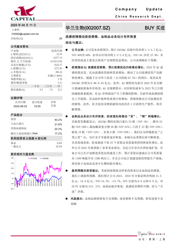 本报告分析了华兰生物2023年第一季度的业绩表现,指出公司受益于流感疫情推动的疫苗销售增长以及防疫政策放宽带来的血制品业务复苏。报告强调,公司新增采浆站的获批将有助于提升采浆能力,为血制品业务的长期增长奠定基础。基于对公司未来盈利能力的乐观预期,报告上调了盈利预测,并维持“买进”评级。