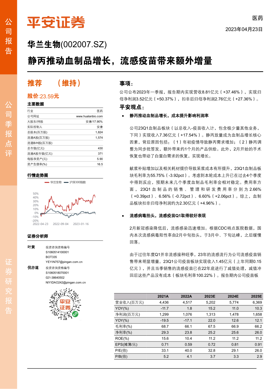 华兰生物2023年一季度业绩表现出色,静丙驱动血制品业务增长,流感疫苗带来显著增量。尽管成本上升对毛利率产生一定影响,但公司全年业绩可期。维持对公司“推荐”评级,但需关注市场竞争、研发和销售推广等风险。