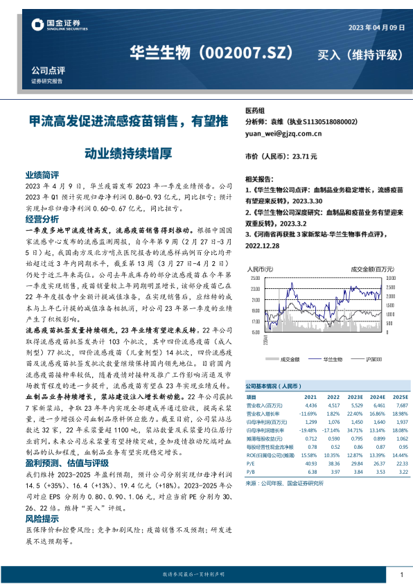 华兰疫苗在2023年第一季度实现了显著的业绩扭亏为盈,主要得益于甲流疫情推动下的流感疫苗销售增长以及前期减值准备的积极财务影响。公司在流感疫苗领域保持批签发量领先地位,并预计随着市场环境改善和接种率提升,该业务将在2023年迎来业绩反转。同时,血制品业务通过新建浆站和采浆量的持续增长,为公司提供了新的增长动力,浆站数量和采浆量均位居行业前列。财务预测显示,公司未来几年营收和净利润将保持稳健增长,净资产收益率和经营现金流状况良好。尽管面临医保降价控费、竞争加剧、疫苗销售不及预期及研发进展不达预期等风险,但基于其在疫苗和血制品领域的双轮驱动战略和领先的市场地位,国金证券维持“买入”评级,看好公司未来的发展潜力。