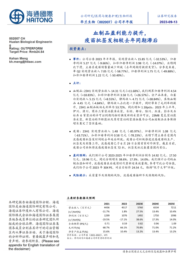 本报告分析了华兰生物2023年半年度报告,核心观点如下:
