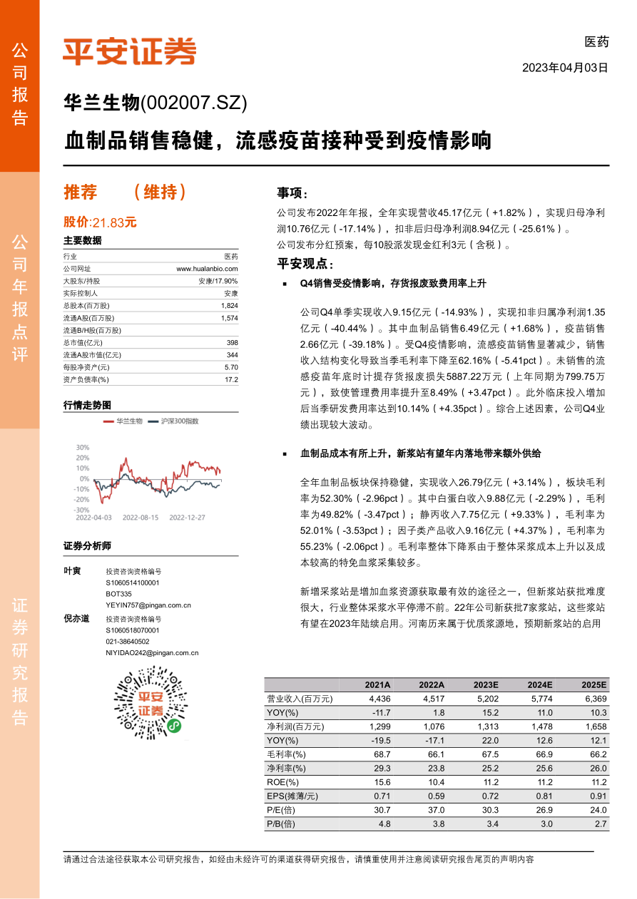 本报告分析了华兰生物2022年年报,核心观点如下: