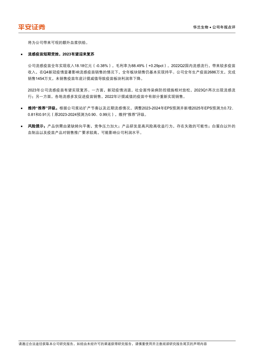 华兰生物2022年血制品业务保持稳健增长,但受疫情影响,流感疫苗销售额有所下降,Q4单季业绩波动较大。公司积极扩张浆站,有望在未来带来可观的血浆供给。维持对华兰生物的“推荐”评级,并调整了未来几年的盈利预测。投资者应关注产品供需变化、研发风险以及销售推广情况。