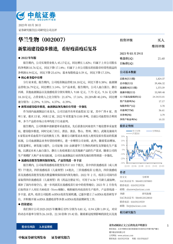 我们预计公司2023-2025年摊薄后EPS分别为0.81元、0.94元和1.09元,对应的动态市盈率分别为26.18倍、22.50倍和19.42倍。随着新冠疫情影响的淡化以及流感疫苗接种意愿的增强,公司疫苗业务有望恢复增长;此外,随着河南省新设浆站的陆续投入使用,有望为公司贡献业绩增量。维持买入评级