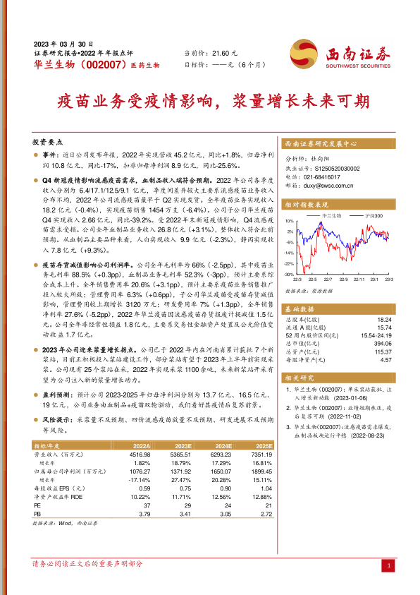 本报告分析了华兰生物2022年年报,指出公司业绩受到疫情影响,但血制品业务稳健,未来浆量增长可期。报告预测了公司未来几年的盈利情况,并提示了相关风险。总体而言,报告认为华兰生物具备长期增长潜力,但投资者需关注相关风险因素。