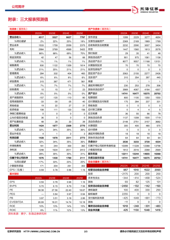 投资建议:我们预测公司2023-2025年归属于母公司净利润分别为14.30亿元、17.60亿元和22.11亿元,对应EPS分别为0.78元、0.96元和1.16元,当前股价对应PE分别为27.0/21.9/18.3倍,维持“买入”评级。