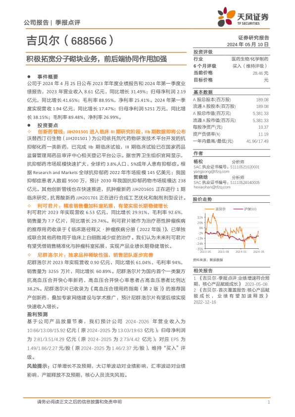 本报告对吉贝尔(688566)2023年年度业绩报告和2024年第一季度业绩报告进行了分析,并维持“买入”评级。
