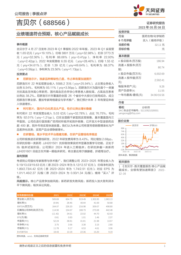 本报告对吉贝尔(688566)2023年Q1季报和2022年年报进行了分析,核心观点如下: