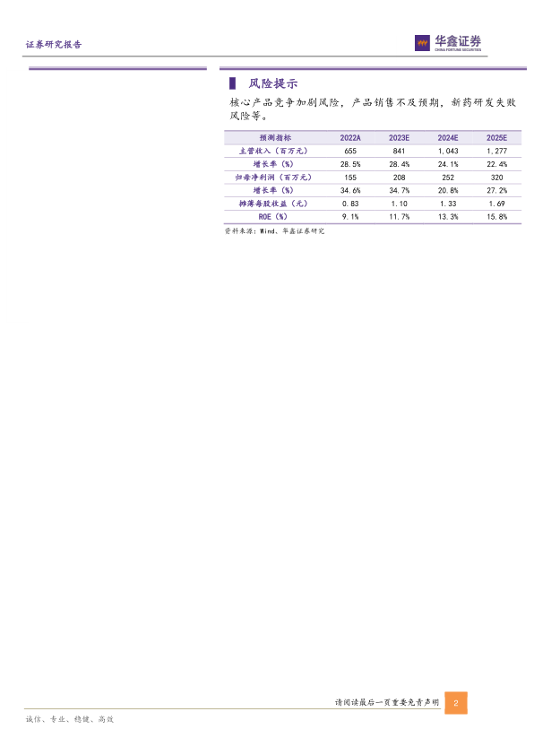 预测公司 2023-2025 年收入分别为 8.41、 10.43、 12.77 元,EPS 分别为 1.10、 1.33、 1.69 元,当前股价对应 PE 分别为26.0、 21.6、 16.9 倍。 公司核心产品技术壁垒高、市场潜力大,存量品种成长确定性较强,同时新品研发正积极推进,后续成长可期。 维持“买入”投资评级。