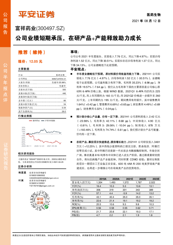 富祥药业2021年上半年业绩受到原材料价格上涨的影响,导致盈利能力下降。然而,公司积极推进在研产品和募投项目,特别是在β内酰胺酶抑制剂和培南类产品领域,以及抗病毒领域的拓展,为未来的增长奠定了基础。平安证券维持对公司的“推荐”评级,但考虑到短期业绩压力,下调了盈利预测。投资者应关注市场竞争、研发进展以及安全环保等风险。