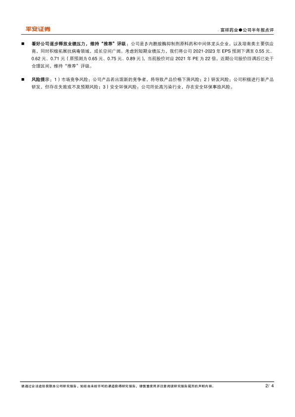 看好公司逐步释放业绩压力,维持“推荐”评级:公司是β内酰胺酶抑制剂原料药和中间体龙头企业,以及培南类主要供应商,同时积极拓展抗病毒领域,成长空间广阔。考虑到短期业绩压力,我们将公司2021-2023年EPS预测下调至0.55元、0.62元、0.71元(原预测为0.65元、0.75元、0.89元),当前股价对应2021年PE为22倍,近期公司股价回调后已处于合理区间,维持“推荐”评级。