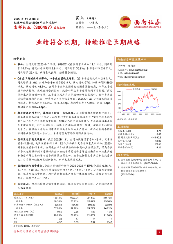 富祥药业2020年前三季度业绩表现稳健,营收和净利润均实现双位数增长。尽管第三季度受停产检修和下游去库存影响出现短期波动,但公司盈利能力持续提升。通过推进股票定增募投项目,公司正积极深化纵向一体化战略,扩大抗病毒药物中间体业务并向下游延伸。凭借在β-内酰胺酶抑制剂和碳青霉烯类产品领域的领先地位以及持续的研发创新,公司具备长期增长潜力。分析师维持“买入”评级,并对公司未来发展持乐观态度,但提示了相关市场和运营风险。